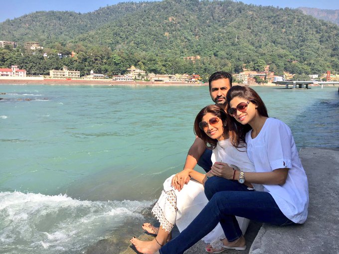 Shilpa took to her Twitter page to share a picture where you see her along with hubby Raj Kundra and sister Shamity Shetty near the banks of the river Ganga.