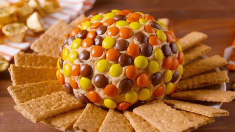 And how could it not? This Reese’s ball is essentially peanut butter cookie dough (without the flour) as a cheese ball: cream cheese, sugar, vanilla, peanut butter, and Reese’s. In other words, a peanut butter dream. We’ve made our fair share of cheese balls at Delish (LOL, we even decorated one in mini pepperoni), but hadn’t thought to stud one with Reese’s Pieces, until we saw this beaut. We knew we needed to figure out a worthy PB concoction for dipping.